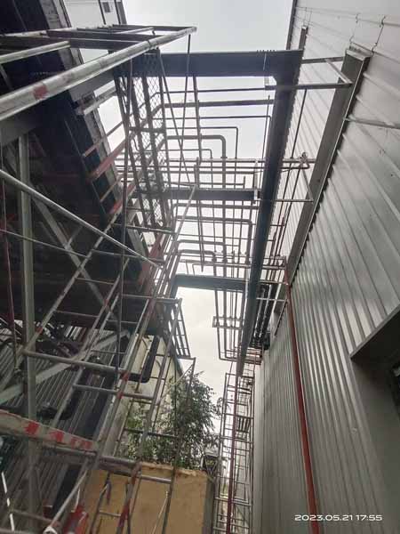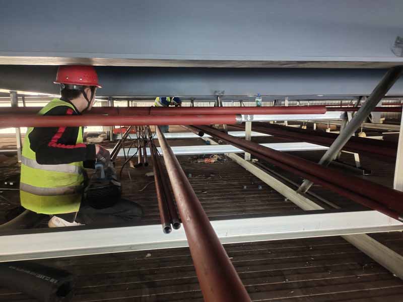 1、原料庫布線及庫燈安裝完成。 2、庫頂管道支架完成, 3、庫頂無縫鋼管作業(yè) 4、成品庫庫頂安裝完成 5、開關(guān)布線