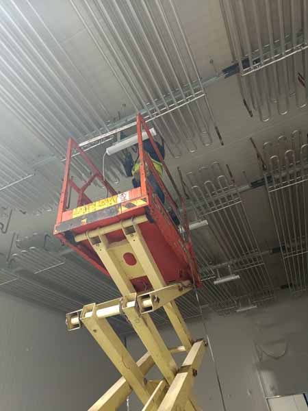 1、裝修水電安裝施工作業(yè) 2、蒸發(fā)冷設(shè)備機(jī)組管道焊接作業(yè)。 3、制冷管道保溫 4、圓弧施作業(yè).鋼制門安裝 5、管道保溫作業(yè)。 6、無縫鋼管陪管 7、設(shè)備機(jī)組配線。 8、觀察窗安裝完成 9、凍庫控制電柜安裝。 10、平臺設(shè)備動力電施工 11、速凍庫2鋁格柵施工作業(yè) 12、新風(fēng)系統(tǒng)安裝完成95%) 13、衛(wèi)生打掃