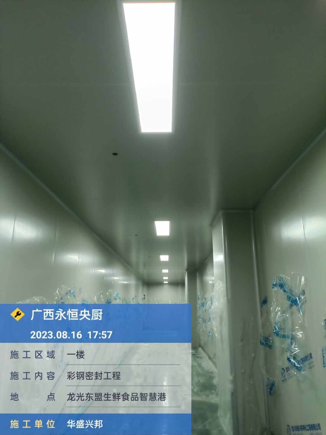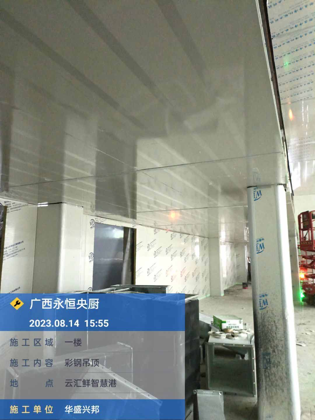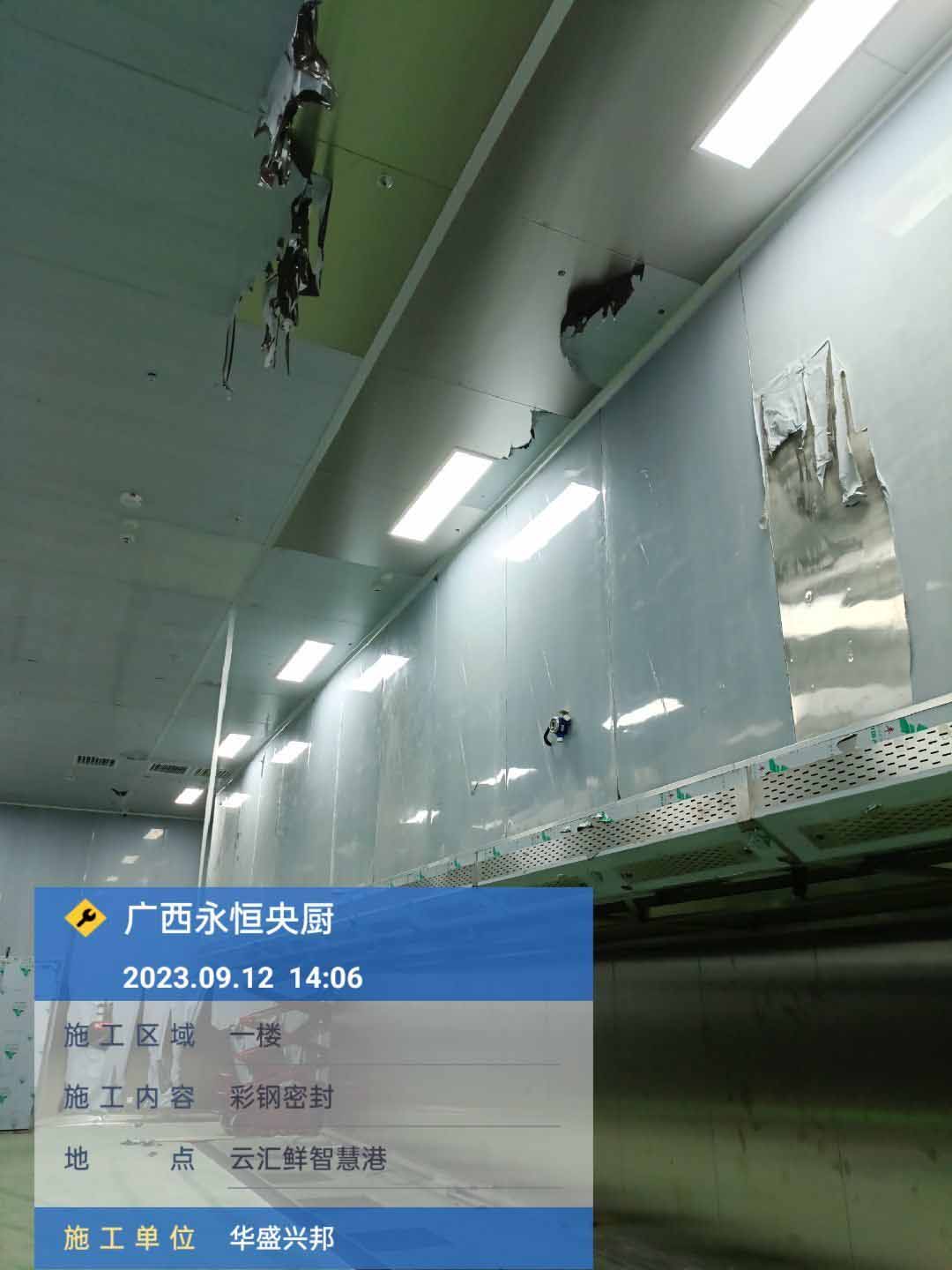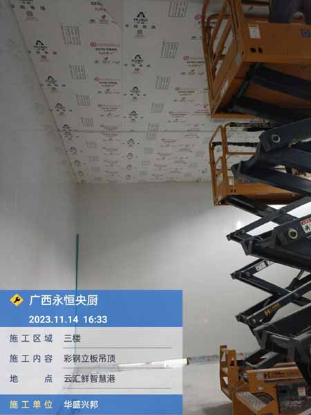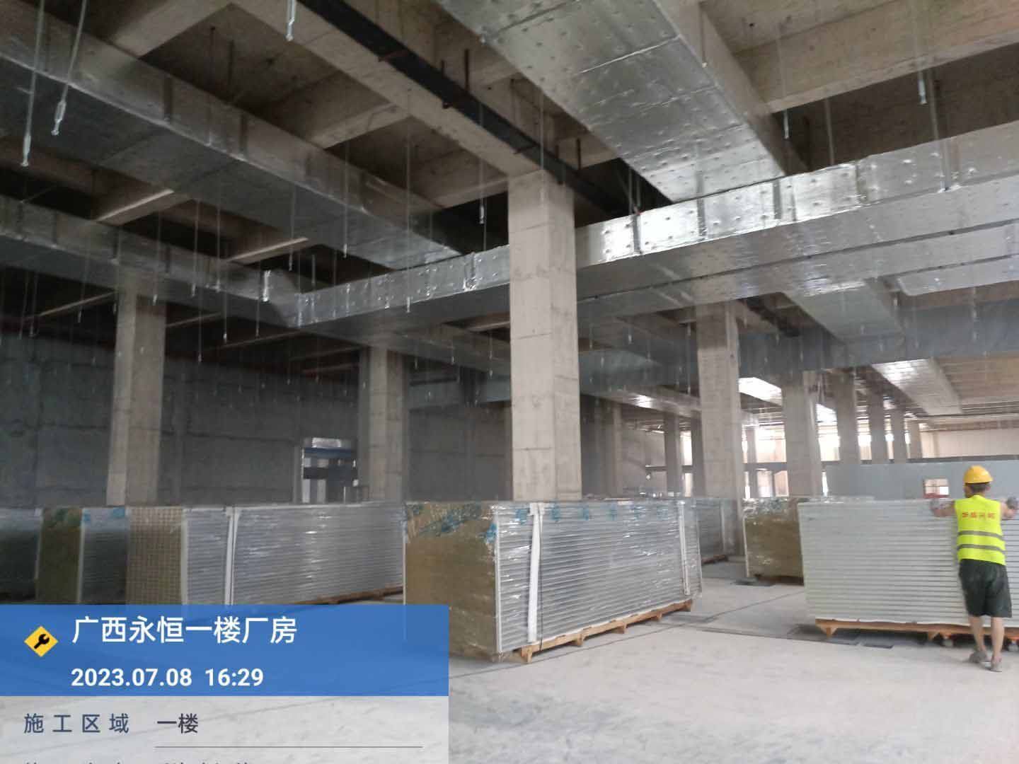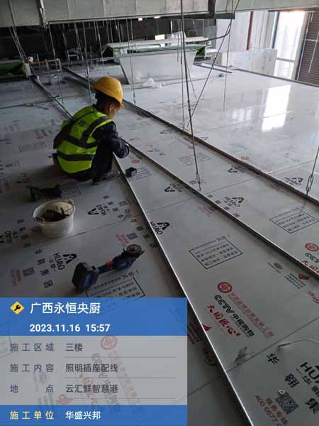 日施工內容 一樓: 1:公區固化施工 三樓: 1: 暖通水管安裝 2: 風管保溫 安裝 3:彩鋼立板 吊頂安裝 4:照明燈具安裝 5:彩鋼密封工程施